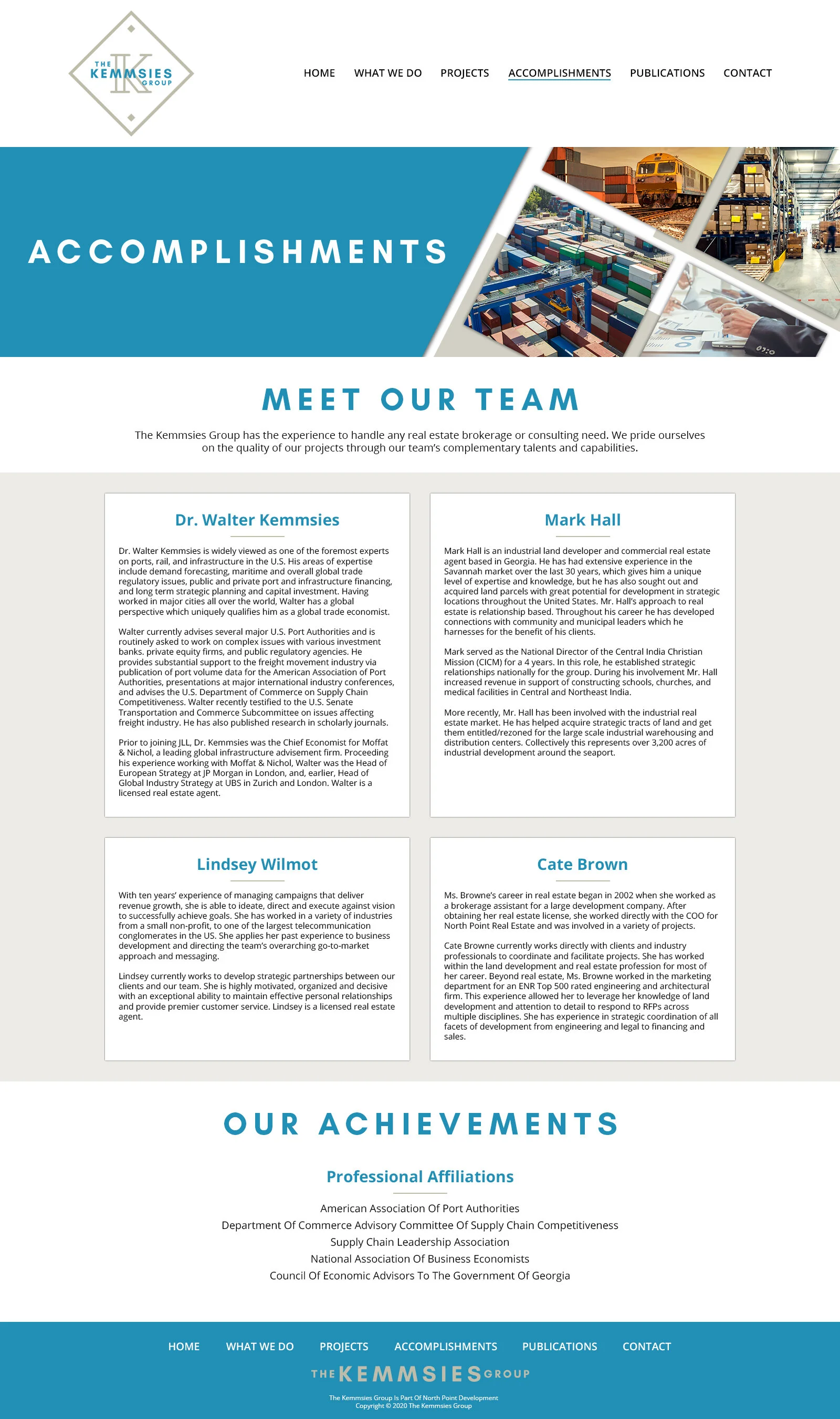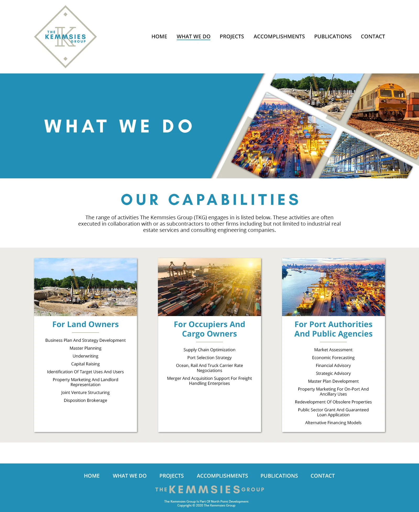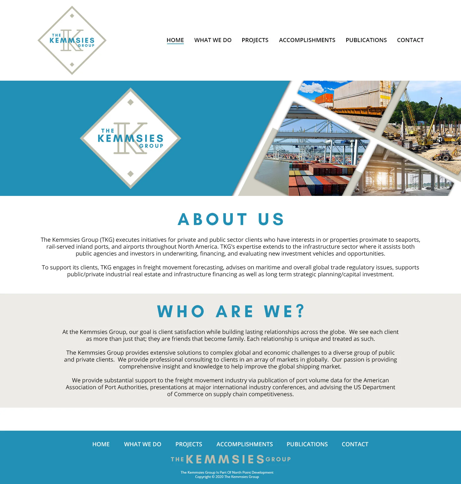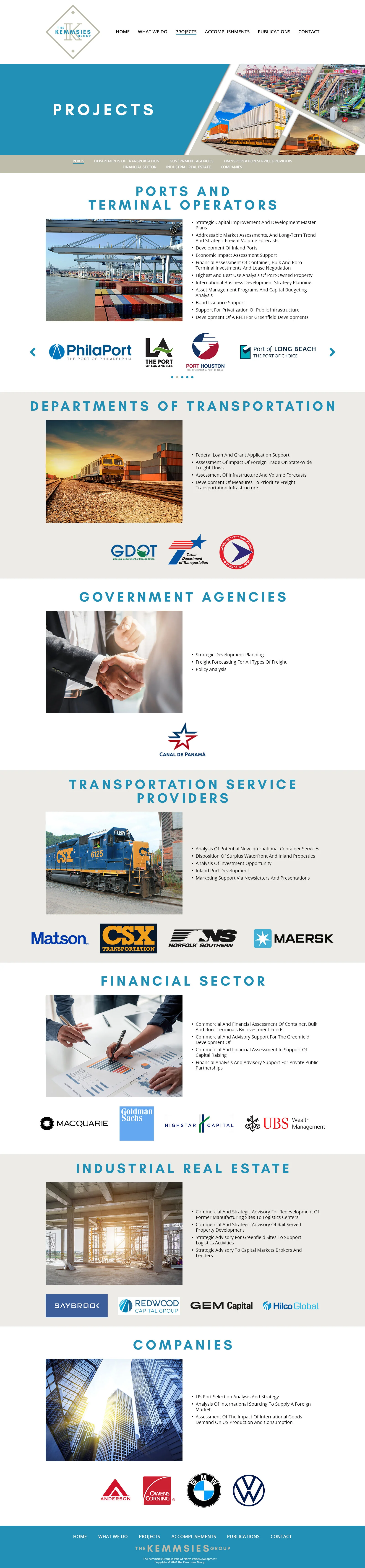 The Kemmsies Group works with clients of both the public and private sector in all things seaports, inland ports, railways, and airports throughout North America. The Group also provides extensive solutions to complex global and economic challenges to their clients. The website was designed to highlight past and current clients, provide insight for potential clients, and provide a vast library of informative media by The Kemmsies Group and other experts in the field.
